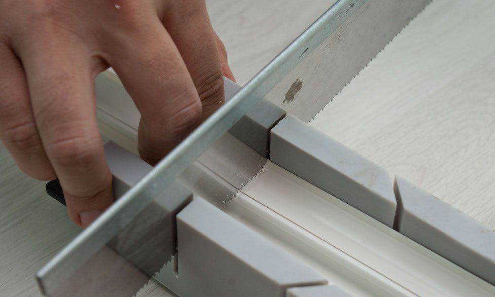 При помощи ножовки производится обрезка плинтуса. Режущий (пилящий) инструмент вставляется в выбранный паз – производится распил.