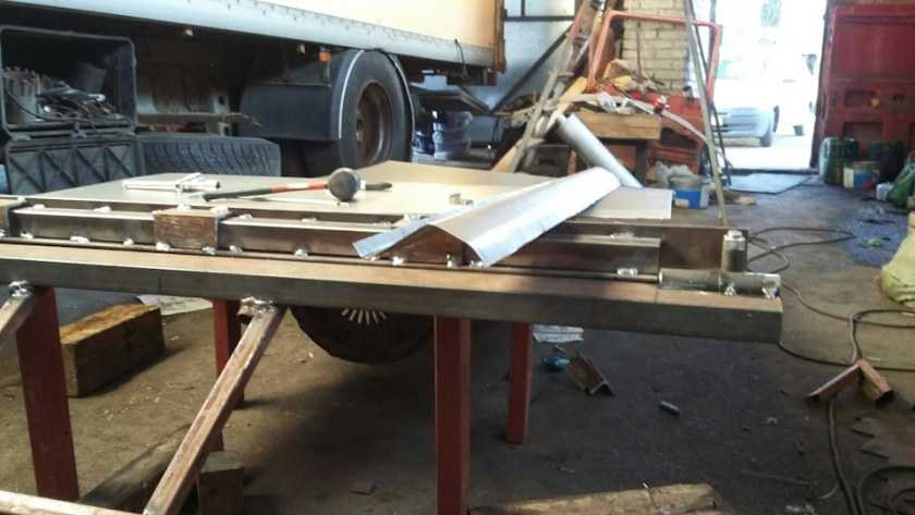 Подобное устройство, сделанное своими руками, домашние мастера используют чаще всего для загиба листовых изделий. Тем более что оно отличается от остальных листогибов большой универсальностью. Рабочий стол в нём создают из металла либо дерева. Размеры такого листогибочного станка — не меньше 2х1 м. Если понадобится согнуть большие заготовки, то можно с задней стороны устройства установить плоскость, размещённую на уровне со столом, или откидную раму. Делается это для крепления металла, чтобы он не выскальзывал при изменении положения.
