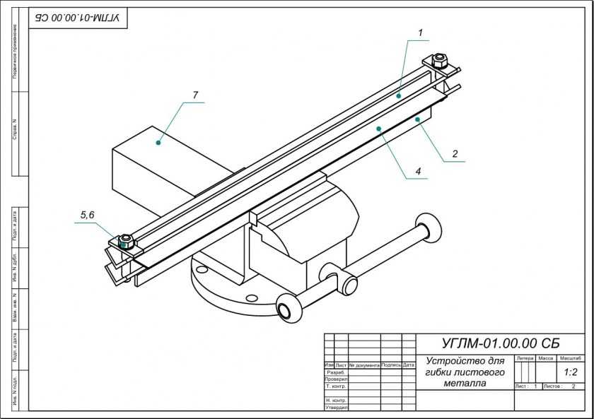 Конструкцию ручного листогибочного станка, показанную на чертеже №1, можно без труда усовершенствовать. По приведенному чертежу видно, что приспособление для гибки листового металла состоит из таких элементов, как: