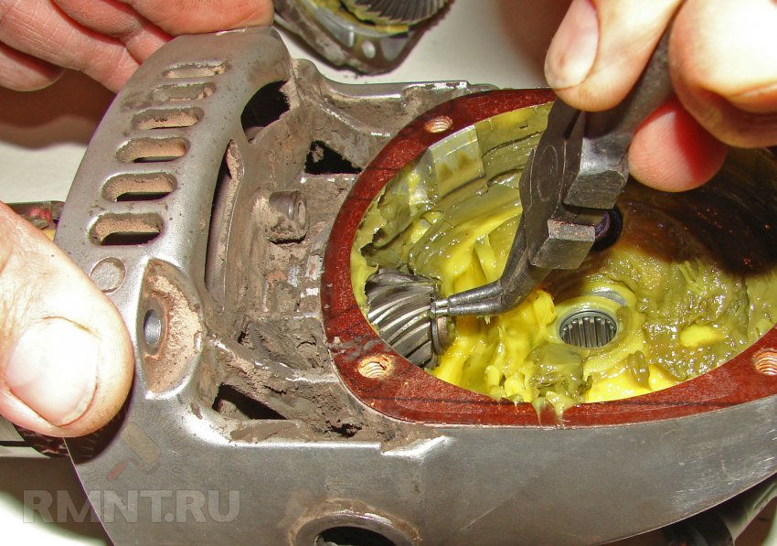 Конический редуктор болгарки будет без проблем работать при свободно вращающихся в подшипниках валах, которые не имеют люфтов. Это достигается установкой дополнительных металлических прокладок на ведущем и ведомом валах, для устранения зазоров образовавшихся в процессе сборки.
