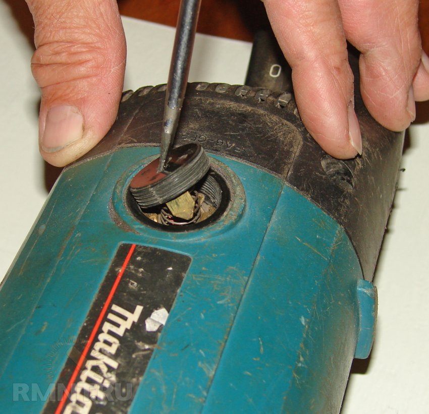 Плоской отвёрткой выкручиваем крышку щёточного узла, снимаем шайбу щёточного узла, чтобы снять крышку инструмента (крышки находятся с двух сторон УШМ) и извлекаем щётки.