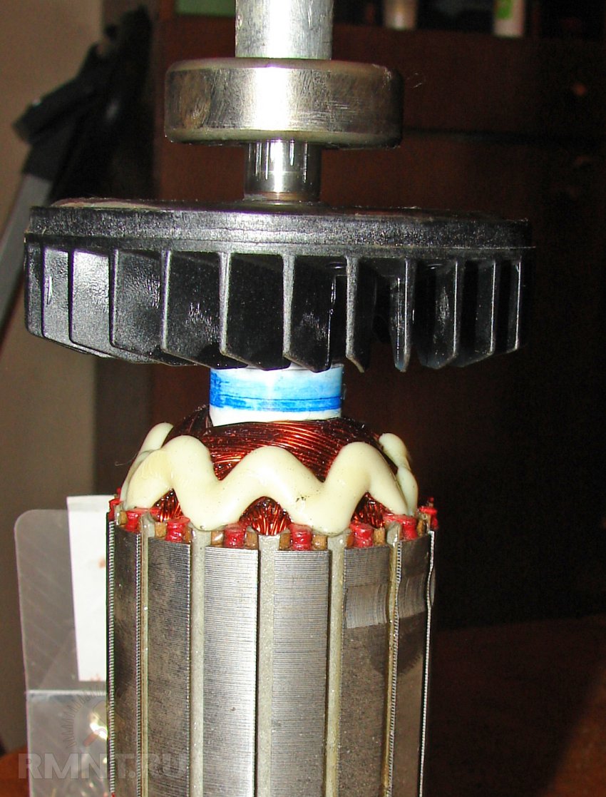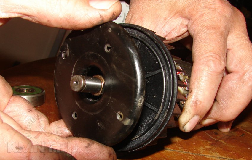 Сборка ротора состоит в запрессовке на него подшипников, установки крыльчатки. Смазанные подшипники напрессовываются на вал при помощи деревянной наставки. Подшипник возле коллектора закрывается резиновой защитой. Это общий алгоритм сборки вала ротора.