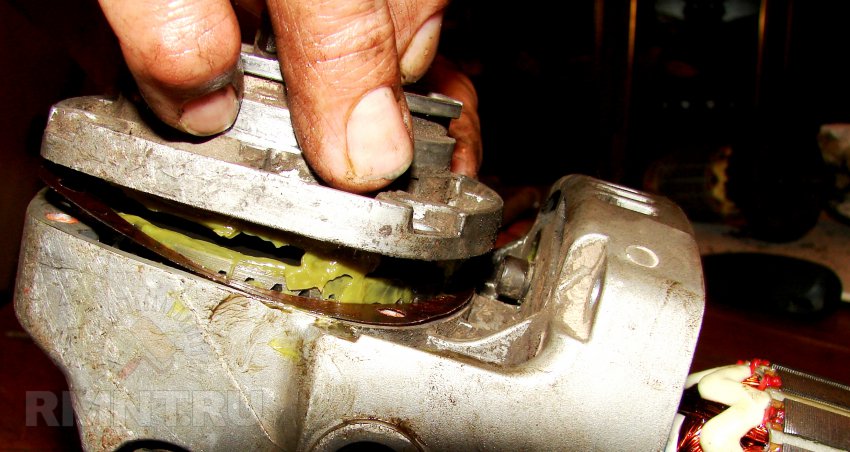 Извлекаем редуктор вместе с якорем и пылезащитным кольцом. Корпус и кольцо откладываем в сторону — с ними работы не производятся.