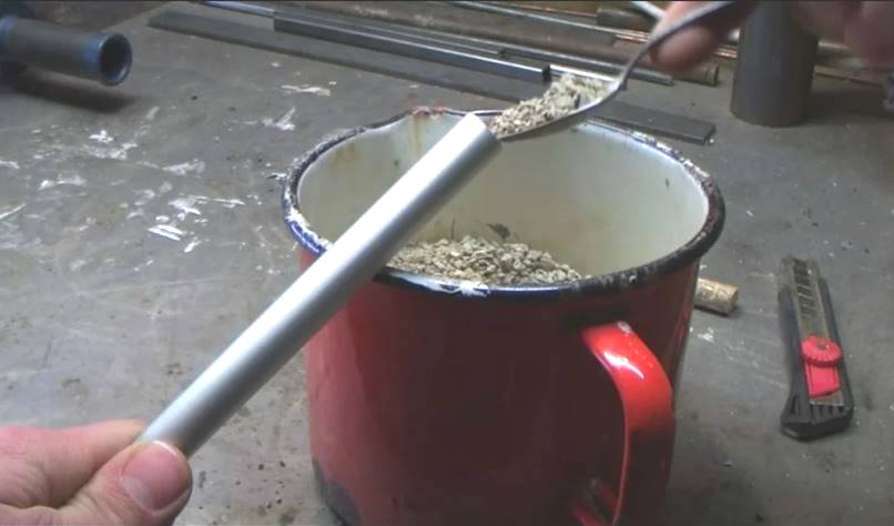 - Заглушить один конец трубы, постепенно засыпать до краев просеянный и прокаленный песок, уплотняя его постукиванием. Заглушить второй конец чопом с пазами;