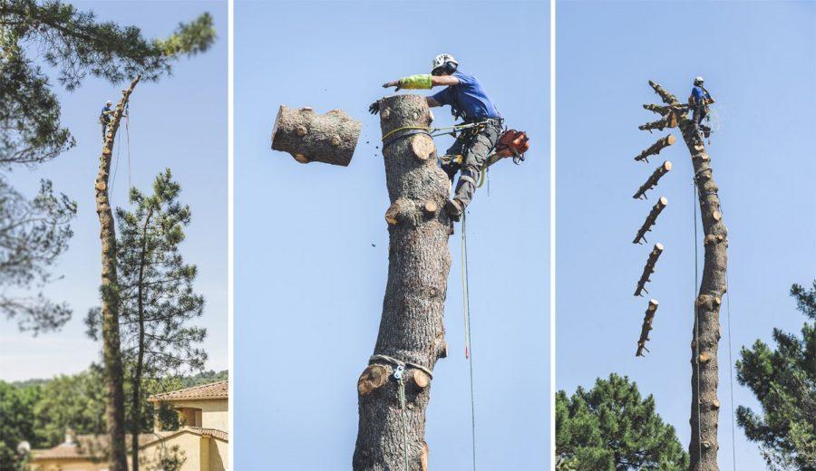 При спиливании большого дерева частями, все начинается с отсекания лишних ветвей и кроны дерева. Страхуется их падение. В окружении не должны находиться провода или участки с людьми, животными, дома.