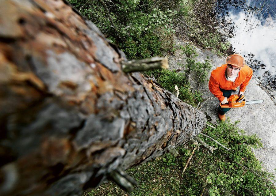 Лучшее время для таких работ — это период от ноября до декабря. В эти месяцы нет большого количества снега, но земля уже мерзлая. При работе с бензопилой держать ее нужно строго двумя руками, не опираясь второй рукой на дерево!