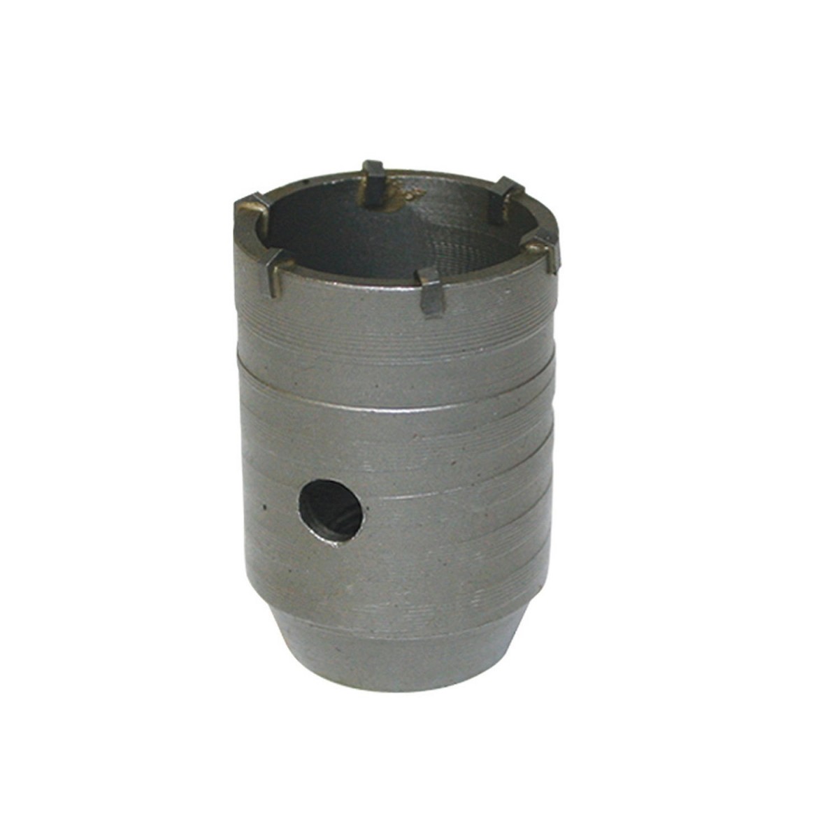 Внешне коронка под розетку выглядит как отрезок стальной трубы с отверстиями в стенке для выхода бетонной пыли и крошки в процессе работы. Один торец трубки заглушен фланцем для крепления коронки в патрон перфоратора со специальными фиксирующими пазами, соответствующими стандарту SDS. С другой стороны торец трубки имеет заточенные по окружности зубья и выступающее центральное сверло, которое фиксирует положение коронки в стене в процессе сверления и предупреждает её «гуляние» при вращении. Центрирующее сверло можно заменить, если оно затупилось или заточить заново.