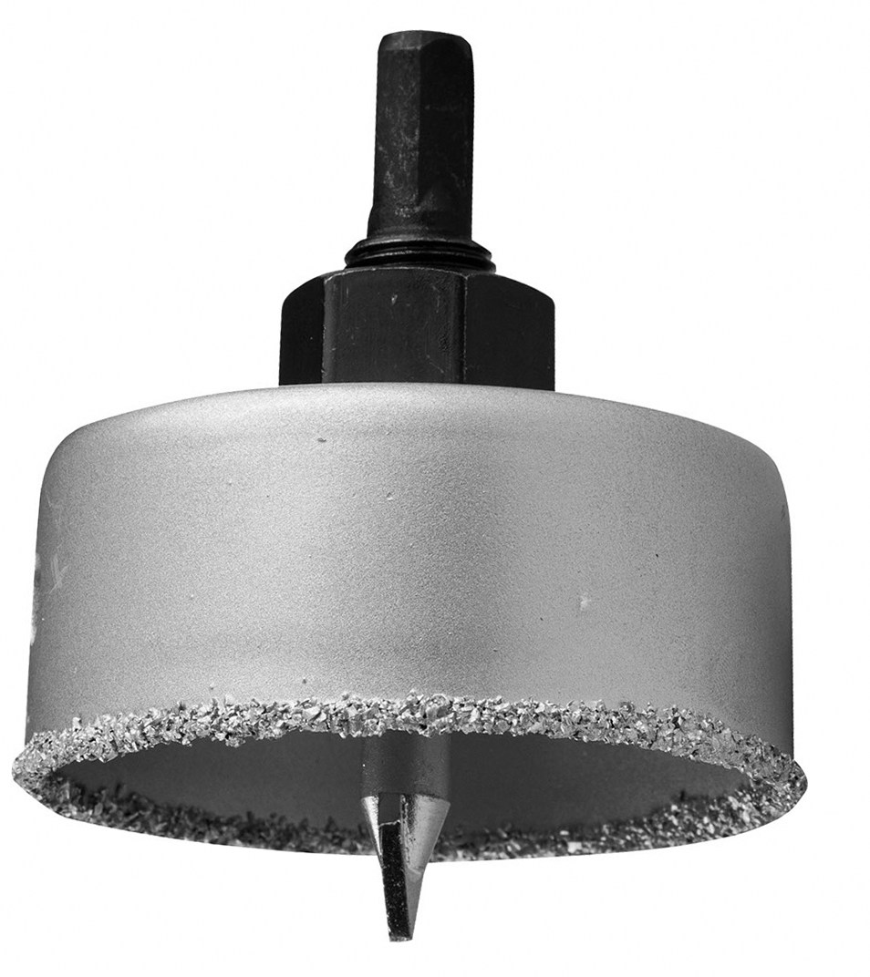 - Твердосплавные (победитовые или из других сплавов). На кромке режущего края находятся напайки из твердого сплава. Используется для сухого ударного бурения нескольких отверстий в бытовых условиях.