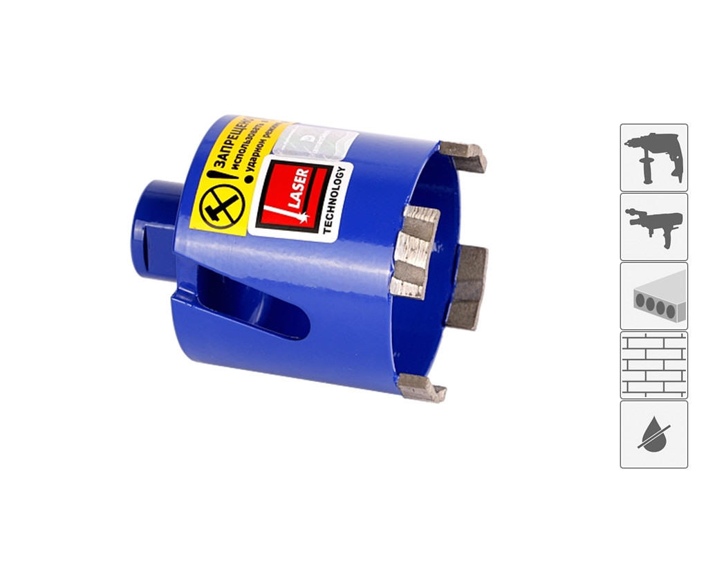 Коронка легко справляется с металлической арматурой бетонных плит. Она имеет рабочие диаметры от 12 до 650мм и позволяет высверливать отверстия до 1,5м в глубину. Насадки размерами до 100мм в диаметре могут применяться, как с профессиональными моделями инструментов, так и с бытовыми дрелями для выполнения работ без применения принудительного охлаждения. Коронки больших диаметров с напайкой алмазных сегментов используются профессиональными бурильными установками с использованием водяного охлаждения и принудительного удаления отходов из отверстия с помощью компрессора.
