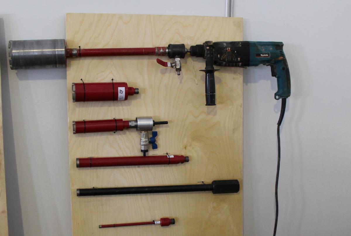В завершении остаётся выключить перфоратор, извлечь высверленный цилиндрический камень из коронки и продолжить работу над другим отверстием.