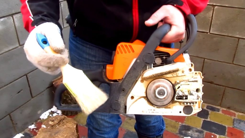 Очистка бензопилы. Как и другие электроинструменты, очистка является ключевой частью правильного обслуживания, особенно потому, что бензопила будет покрыта деревом и пылью к концу рабочего дня. Протерев лезвие, цепь и воздухозаборник, вы обеспечите стабильную бесперебойную работу двигателя и его готовность в следующий раз.