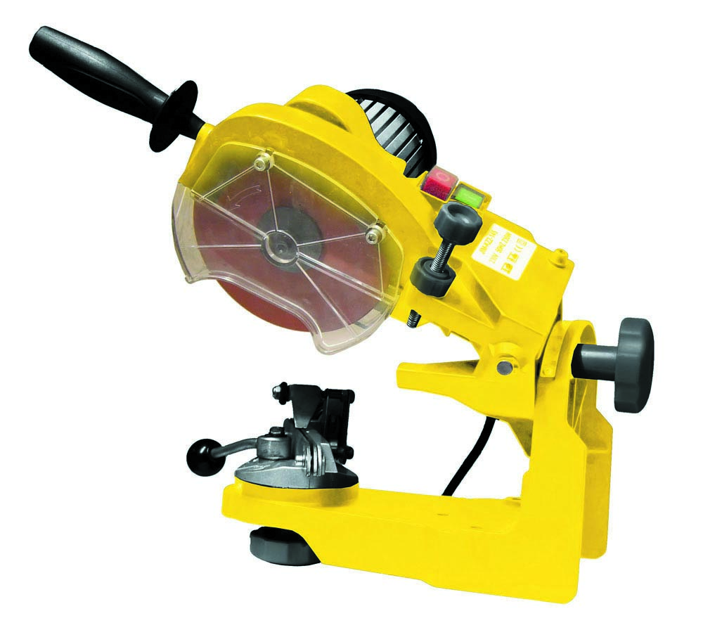 Профессиональный точильный аппарат с мощностью 230 Вт, выдающий 3000 об/мин. Оснащается камнем 14.5х2.2 см, установленным на прямом валу от электромотора. Привод расположен на металлическом кронштейне с опускающимся верхом. На горизонтальной станине из металла есть тисочная прорезь для зажима цепи. Вращающийся наждак закрыт прозрачным кожухом, обеспечивающим надлежащий обзор и безопасность