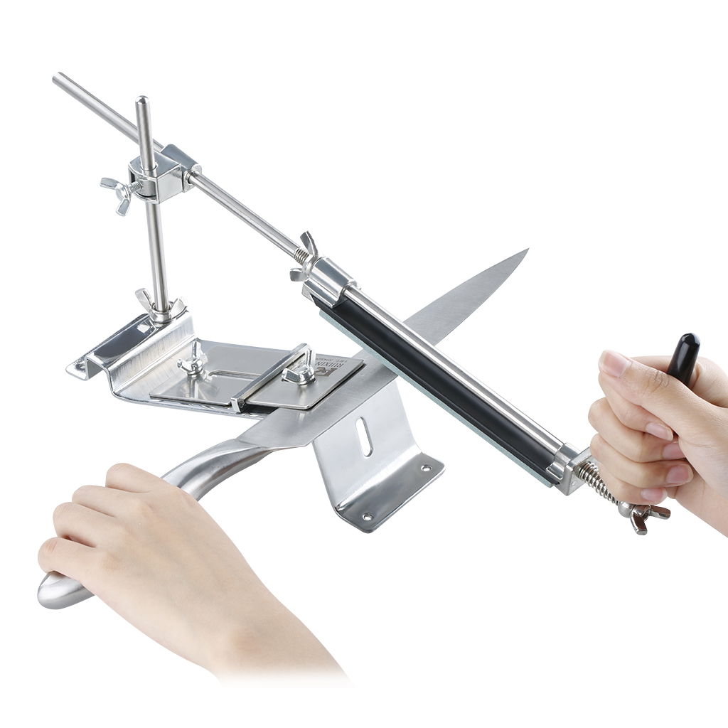 Вторую строчку получает профессиональная ручная точилка. Корпус прибора имеет в основании вакуумную присоску, с помощью которой прибор надёжно крепится к поверхности, чтобы не соскальзывать во время процедуры затачивания. Пользователи отмечают высокую скорость заточки. Абразивные бруски разной зернистости (120, 320, 600, 1500 ед.), прикреплённые к пластиковым планкам, позволяют удобно затачивать лезвие. Цветная маркировка заточки углов (10, 15, 20, 25 30 градусов) помогает сориентироваться в процессе работы. Прибор подойдёт также для ножниц, отвёрток и прочих инструментов.