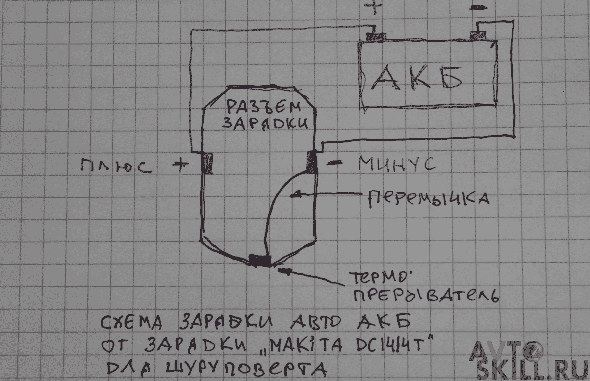 Пример схемы подключения зарядки шуруповерта к АКБ автомобиля
