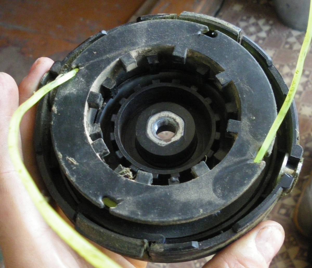Первоначально, перед тем, как заправить леску в катушку триммера, необходимо ее оттуда извлечь. Катушка или наводка — это устройство, которое находится внутри косильной головки, бобины или барабана. Головки бывают разных видов (в зависимости от производителей), однако принцип замены лески на катушке у всех одинаковый. Первым делом разберемся, как снять головку с инструмента, а также как достать из нее барабан с леской.