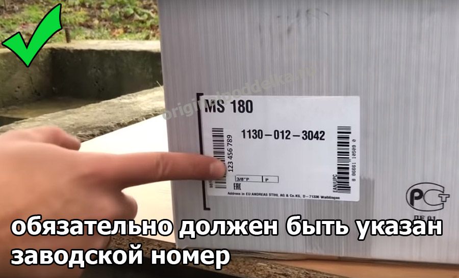 Обратите внимание на маркировку изделия. Серийный номер должен быть выбит на корпусе под глушителем и продублирован наклейками на пиле и упаковочной коробке