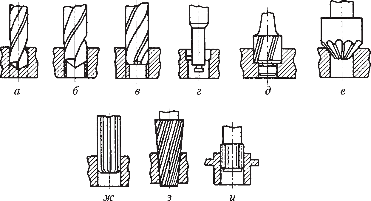 Рис. 1. Работы, выполняемые на сверлильных станках: а — сверление отверстий; б — рассверливание; в — зенкерование; г — растачивание; д — зенкование; е — развертывание; ж — выглаживание; з — нарезание внутренней резьбы; и — цекование