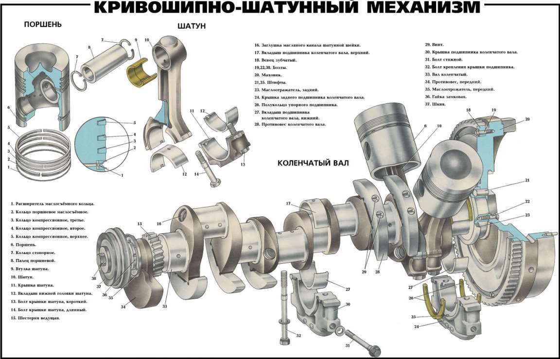 Важные детали механизма, а именно: поршень, шатун и вал помогают преобразовывать движения поступательного характера в движения вращательного, что в свою очередь запускает вращение колес автомобиля.