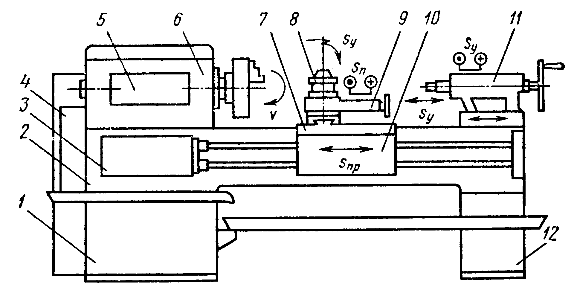 1 – передняя тумба; 2 – станина; 3 – коробка подач; 4 – гитара сменных колёс; 5 – панель управления; 6 – передняя бабка; 7 – продольный суппорт; 8 – поворотный суппорт с резцедержателем; 9 – поперечный суппорт; 10 – фартук; 11 – задняя бабка; 12 – станина