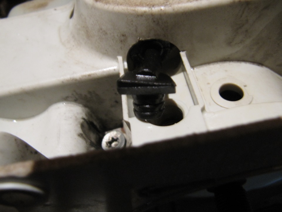 Масляный насос установлен с правой стороны днища корпуса, в том же месте к нему подходит маслопровод, идущий из бака бензопилы. Для снятия насоса, потребуется сначала освободить пилу от рукоятки, для этого раскручивается задняя ручка агрегата и отсоединяется тяга управления дроссельной заслонкой. На следующем этапе, нужно вынуть заглушки амортизаторов рукоятки и при помощи мощной шлицевой отвертки, выдавить их из своих посадочных мест на рукоятке.