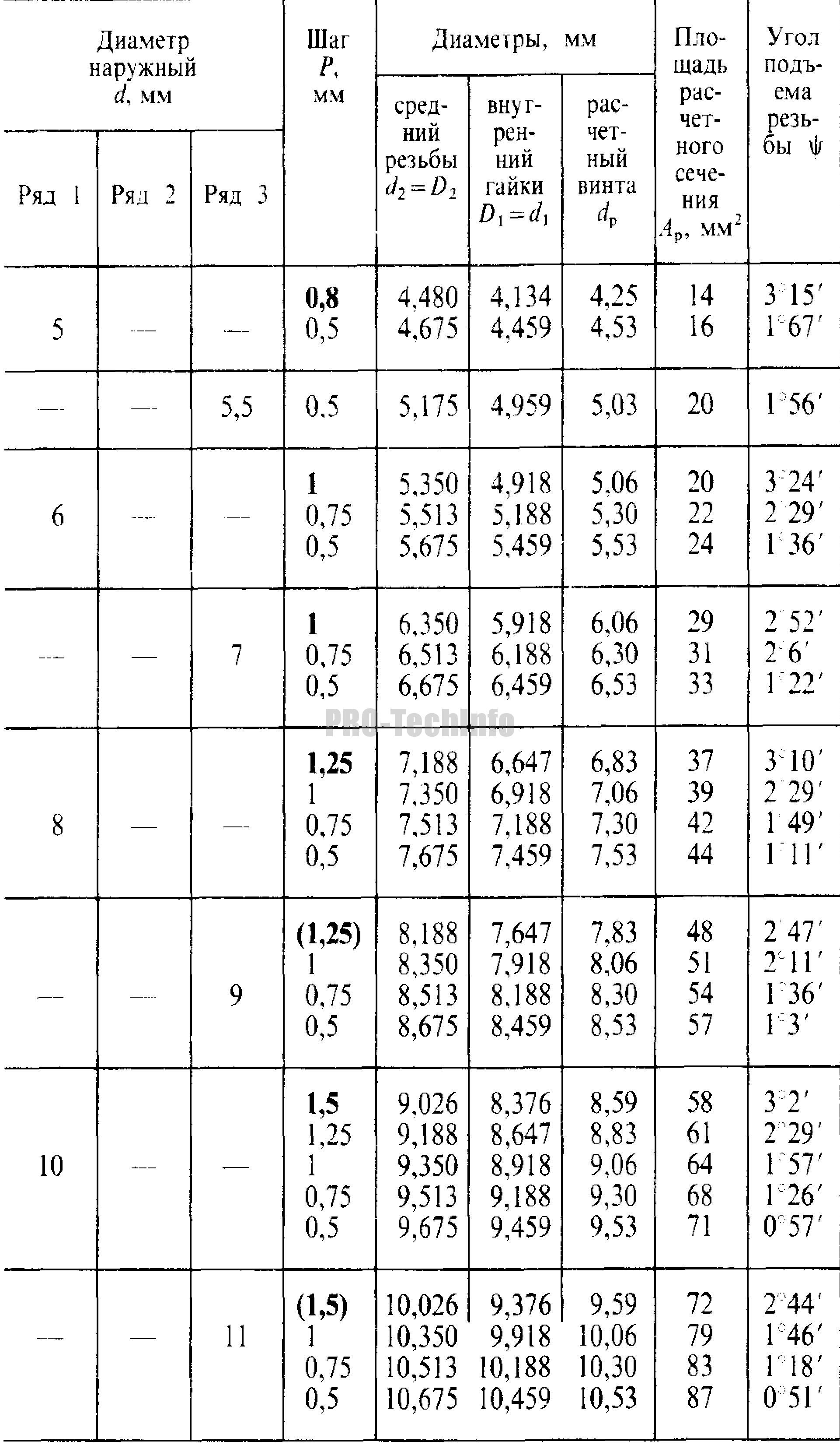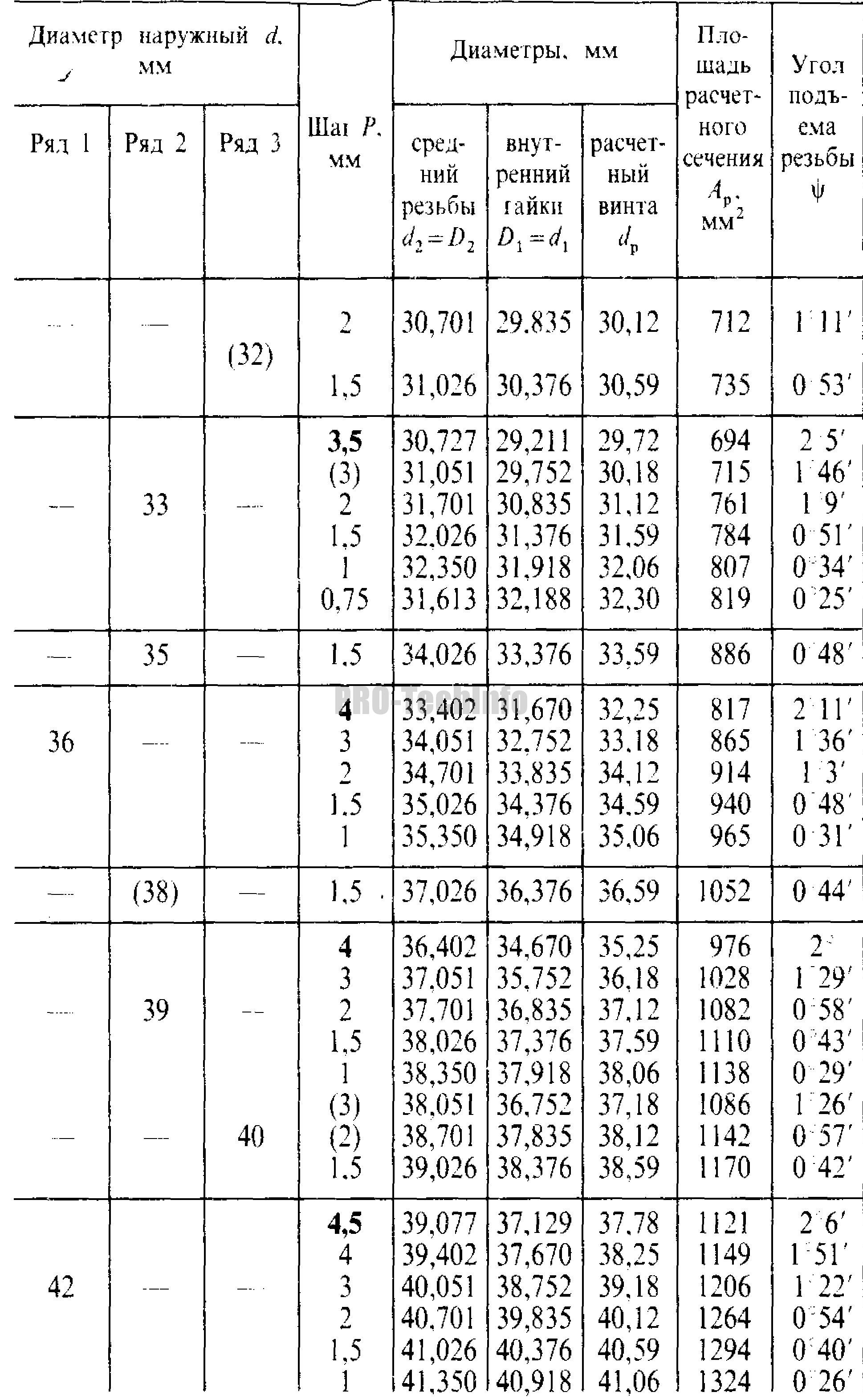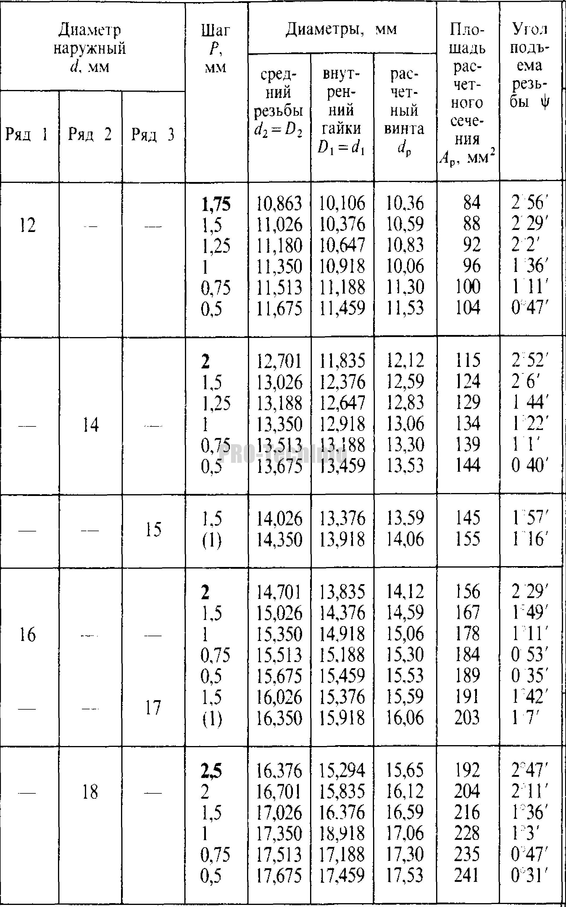 Для облегчения расчетов дополнительно приведены расчетный диаметр винта, площадь расчетного сечения винта и угол подъема винтовой линии на среднем диаметре резьбы.