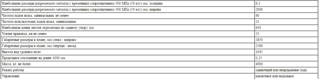 Поперечная резка листа толщиной 6,3 мм и шириной 2000 мм производится за один ход ножа; продольная — при длине реза более 2000 мм производится рядом повторных резов при продвижении листа вдоль линии реза. Резка может производиться как по разметке, так и с помощью заднего упора.