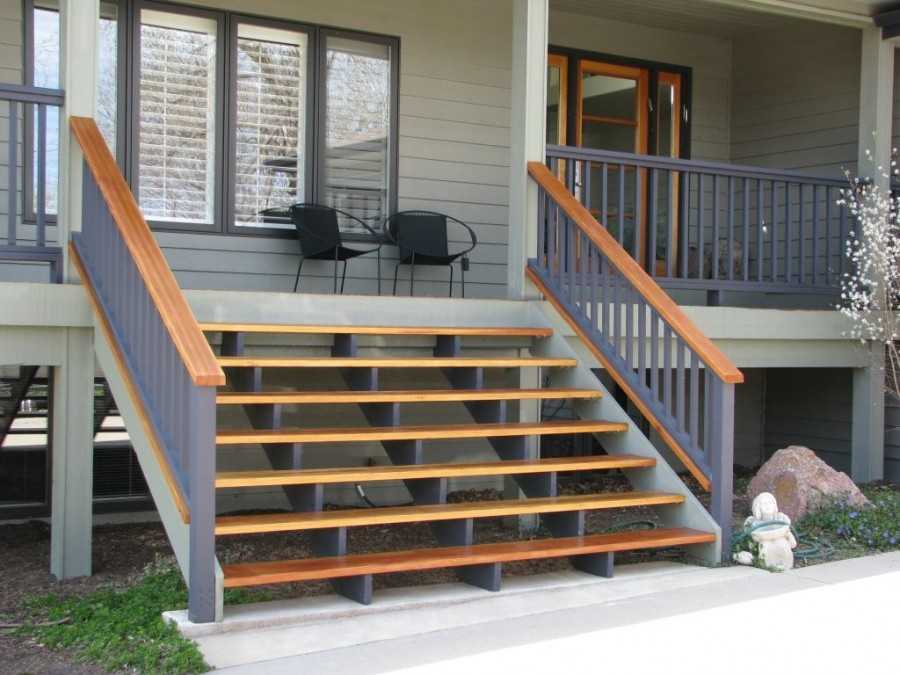 На даче чаще всего встречается самый простой вариант, где высота лестницы чуть выше, чем высота фундамента. Наличие или отсутствие перил – дело удобства и вкуса.