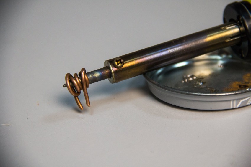 Прямой конец получившегося медного элемента нужно обработать, допустим, при помощи наждачной бумаги, чтобы он был острым, как иголка. Именно этот конец будет жалом самодельного мини-паяльника.