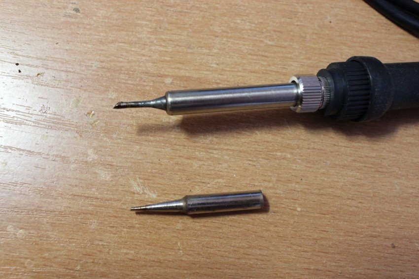- Вставить медное жало в отверстие. Жалу можно придать любую удобную для пайки форму, изогнуть, сплющить, заточить и т.д.
