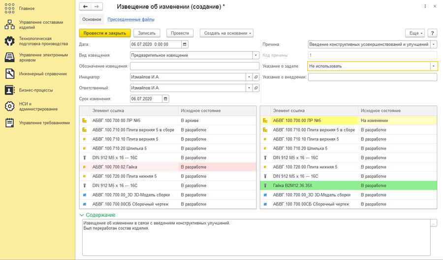 Система позволяет проводить изменения как в формате извещения об изменении, так и в упрощенном формате автоматического оповещения абонентов об изменении версии. Использование этих инструментов позволяет вести детальную историю изменений данных об изделии и получать в режиме реального времени информацию о проведении изменений: