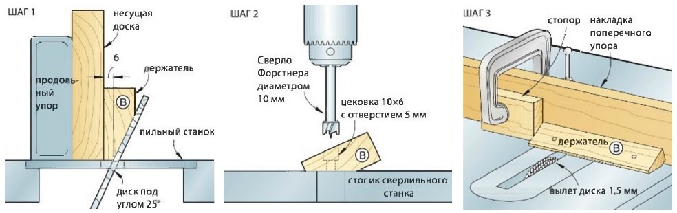 Из заготовки размером 19x45x255 мм сделайте держатель (В). Наклоните пильный диск на угол 25° и, прикрепив держатель к несущей доске, опилите скос. Установите диск в вертикальное положение и опилите держатель до длины 190 мм. Просверлите с нижней стороны два отверстия с цековками (дополнительное углубление под головку винта или гайки) для установки винтов. Центры отверстий располагаются на расстоянии 32 мм от концов держателя. Сначала сделайте цековки, а затем просверлите в центре каждой из них 5-миллиметровое отверстие. Установите в пильный станок пазовый диск и с помощью поперечною (углового) упора сделайте углубление шириной 102 и глубиной 1,5 мм. Это углубление поможет закрепить затачиваемые инструменты под прямым углом к рабочей поверхности.
