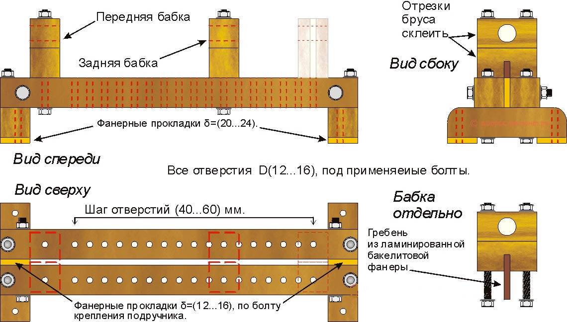 Помимо этого, между стойками бабок пускаются две параллельные рейки, на которых крепится подвижная дощечка-суппорт. Между рейками выдерживается зазор в 5 см. После необходимо сварить станину сварочным аппаратом — это придаст дополнительную прочность конструкции.