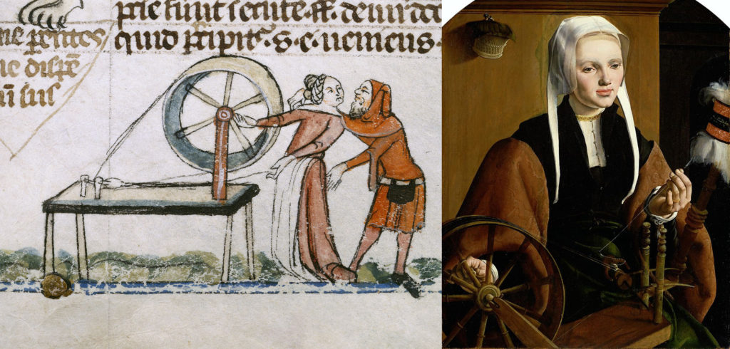 Рис. 1. Слева. Фрагмент из «Декреталий Григория IX». Примерно 1340 год. Справа. Мартен ван Хемскерк. Портрет женщины с прялкой. 1529 год