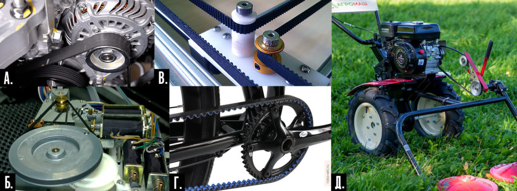 Рис. 3. Примеры использования ремённых передач. А – ремень ГРМ на электрогенераторе двигателя автомобиля. Б – механизм кассетного магнитофона. В – зубчатый ремень 3D -принтера. Г – ремень вместо цепи на велосипеде. Д – ремённая передача на роторной косилке мотоблока