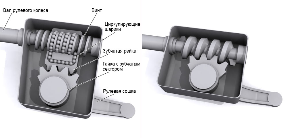 Принципиально работа винтового рулевого механизма схожа с работой червячного механизма. Поворот рулевого колеса сопровождается вращением винта, который перемещает надетую на него гайку. При этом происходит циркуляция шариков. Гайка посредством зубчатой рейки перемещает зубчатый сектор и с ним рулевую сошку.