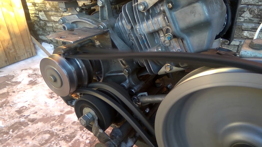 Подсоединить новые агрокомплектующие. Для начала с привода двигателя снимите шкив. Ремень натяните на редукторный шкив (последний остается на месте), затем установите двигательный шкив