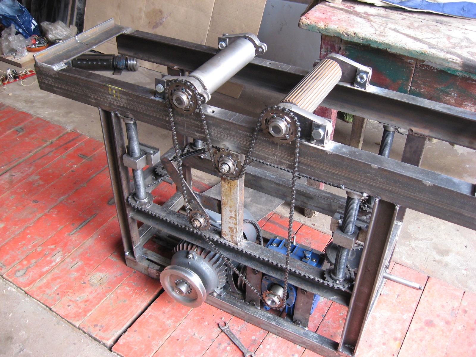 | Протяжка | Она представляет собой модификацию выжимных резиновых валиков от старой стиральной машины. Валики расточены под подшипники и посажены на оси толщиной 20 мм. Подача – ручная, осуществляется вращением рукоятки. |