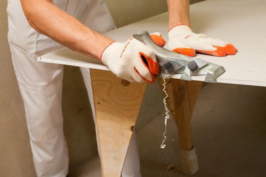 - Подлежащий обработке гипсокартонный лист устанавливается ребром по отношению к мастеру;
