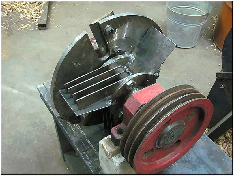 Когда изготовление и сборка щепореза подошли к концу, его крепят на раму, закрывают шкив кожухом (из соображений безопасности) и делают пробный запуск. Сначала вхолостую – пусть детали немного притрутся, а потом уже и с подачей обрезков. В первую неделю самодельный станок для щепы арболита лучше эксплуатировать в щадящем режиме, чтобы подшипники не перегревались, иначе их заклинит.