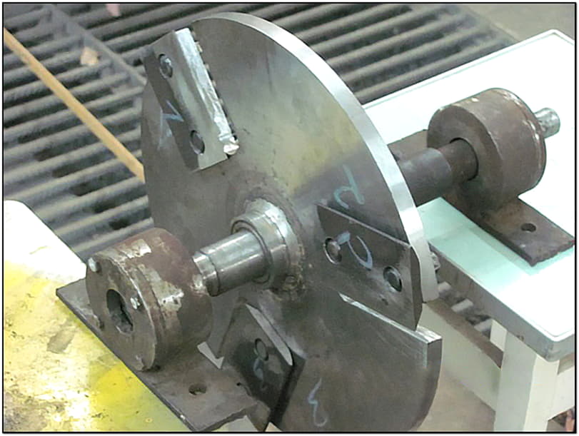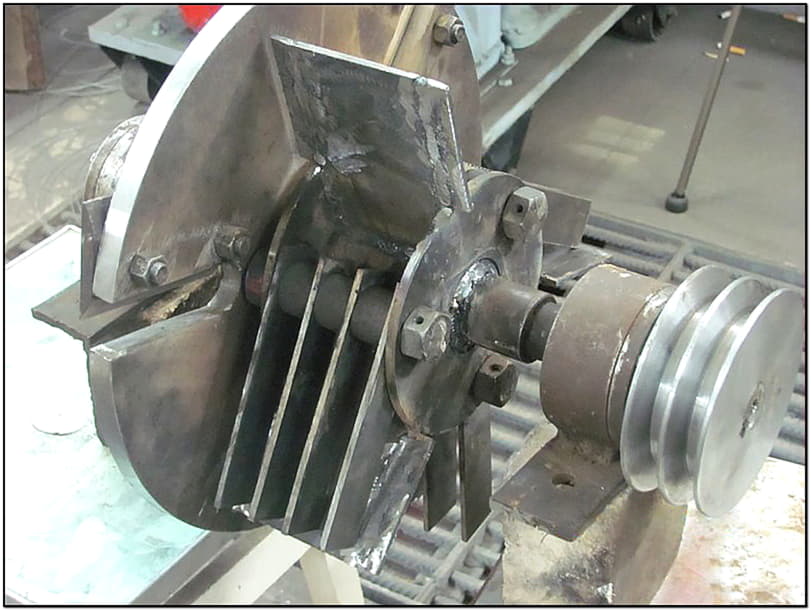 Важно! Сам режущий узел не должен цепляться за стенки корпуса, поэтому чтобы режущий узел свободно размещался в корпусе, диаметр маховика должен быть меньше размера корпуса на 30–50 мм. Оборудование дробильного узла: цапфы вала, на которые необходимо насадить опорные подшипники, плюс била (молотки) и режущий диск