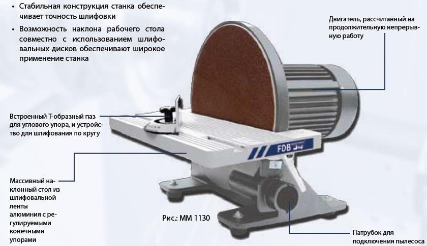 - Дисковые или тарельчатые – один из самых распространенных вариантов исполнения. К особенностям конструкции можно назвать использование специального диска, к которому проводится прикрепление абразивного материала. Дисковые могут использоваться для произведения большого количества различных операций. Именно поэтому тарельчатый тип станков по шлифованию дерева встречается крайне часто.