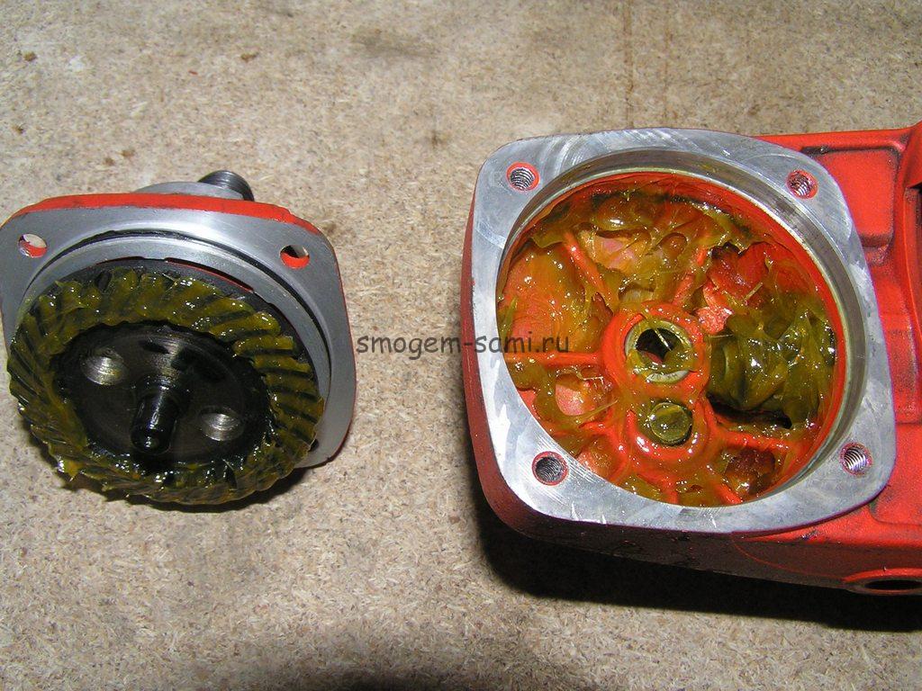 Это происходит потому, что УШМ (углошлифовальная машинка) работает на высоких оборотах. Под воздействием центробежный силы частицы масла стремятся удалиться от оси вращения. При длительной работе поверхности шестеренок становятся совершенно сухими, и без смазки металл стирается. В данном случае достаточно смазать зубцы шестерней имеющимся составом, после этого закрыть редуктор и работать до следующей профилактики.
