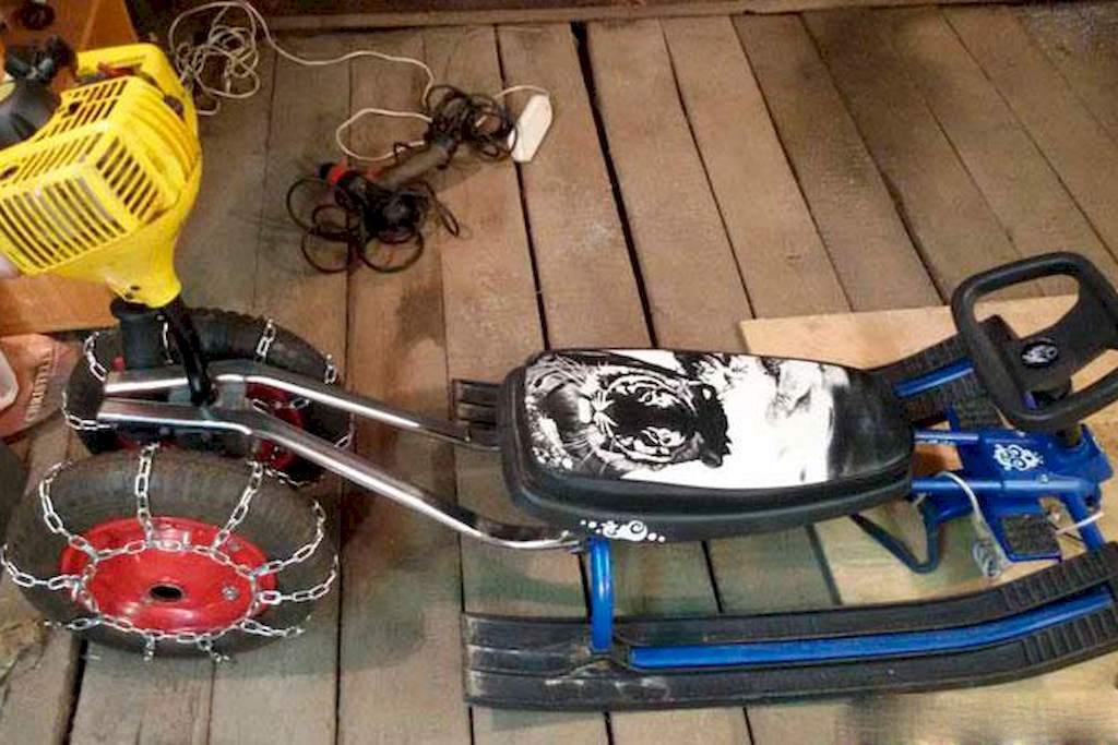 Старые санки проверяют на прочность. Если нет необходимости в ремонте, нужно закрепить полозья. В этом качестве выступают пластиковые элементы или металлические пластины (вырезают из листового металла). Затем следует установить планки, соединяющие снегокат и его двигатель. Для этого используют ножки офисных стульев, их дополнительно изгибают, разрезают, если нужно уменьшить длину. Для формирования рамы применяют элемент крепления, часто используемый на металлических стойках магазинов одежды. С его помощью труба санок охватывается со всех сторон, затягивается болтовым соединением, зафиксировав ножку офисного стула.