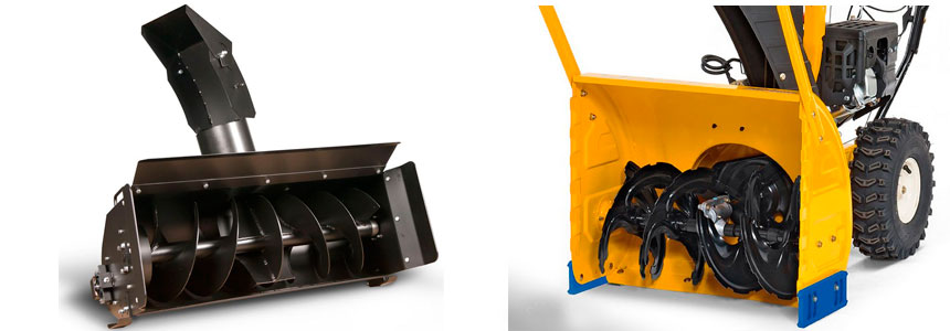 - В двухступенчатых снег со шнека попадает на крыльчатку, которая и отбрасывает снег. Расстояние выброса достигает 15 м. Шнек таких агрегатов не касается земли вплотную, поэтому их можно использовать для очистки как мощённых, так и насыпных дорожек. Справятся с сугробами высотой до 70 см.
