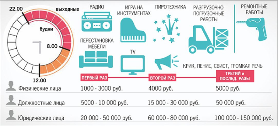 Данные суммы утверждены для жильцов многоэтажных зданий, и как наглядно видно, что для учреждений, несоблюдающих покой в домах, взыскание может достичь до 150 000 рублей, что немало.