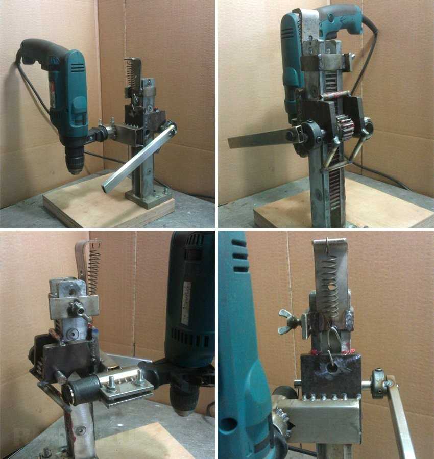 | Из металлической трубы диаметром большим, чем патрон используемой дрели, вырезается крепление, которое приваривается к собранной ранее конструкции. | |