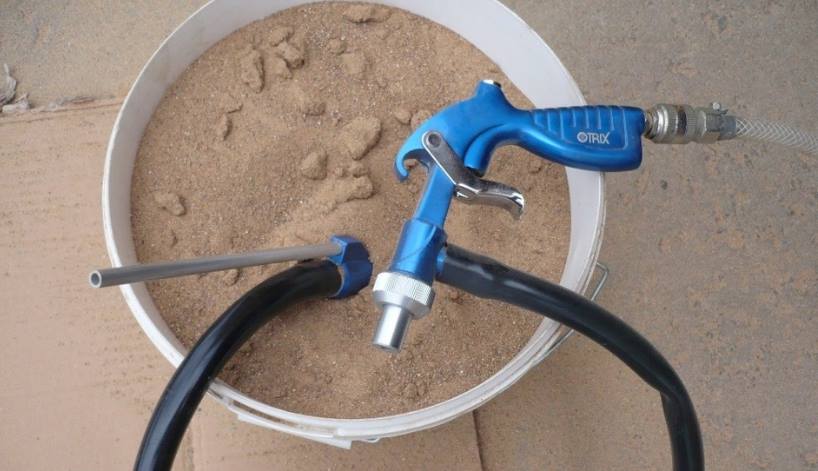 Следующий рукав понадобится протянуть от пистолета к емкости с абразивным материалом. Чем меньше длина рукава, тем легче песок будет всасываться. Диаметр данной детали должен быть равен 20 мм.