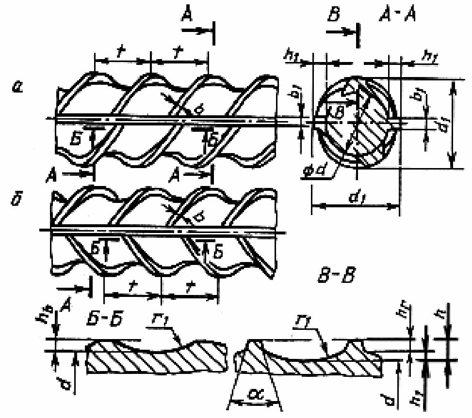 Сталь класса А-III (А400), изготовляемая профилем, приведенным на черт. 1б, и классов А-IV (А600), А-V (А800), А-VI (А1000) профилем, приведенным на черт. 1б, 2б, должна иметь выступы по винтовым линиям, имеющим с одной стороны профиля правый, а с другой – левыйзаходы.