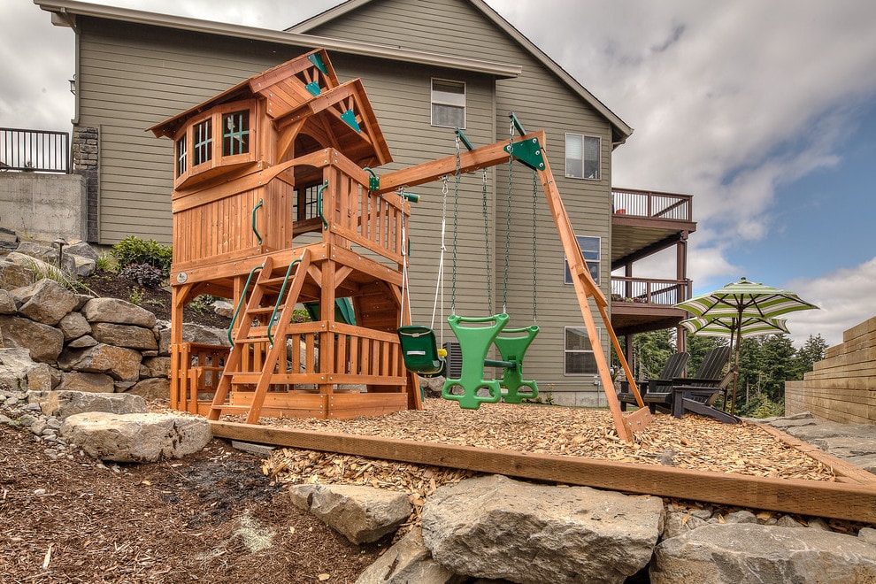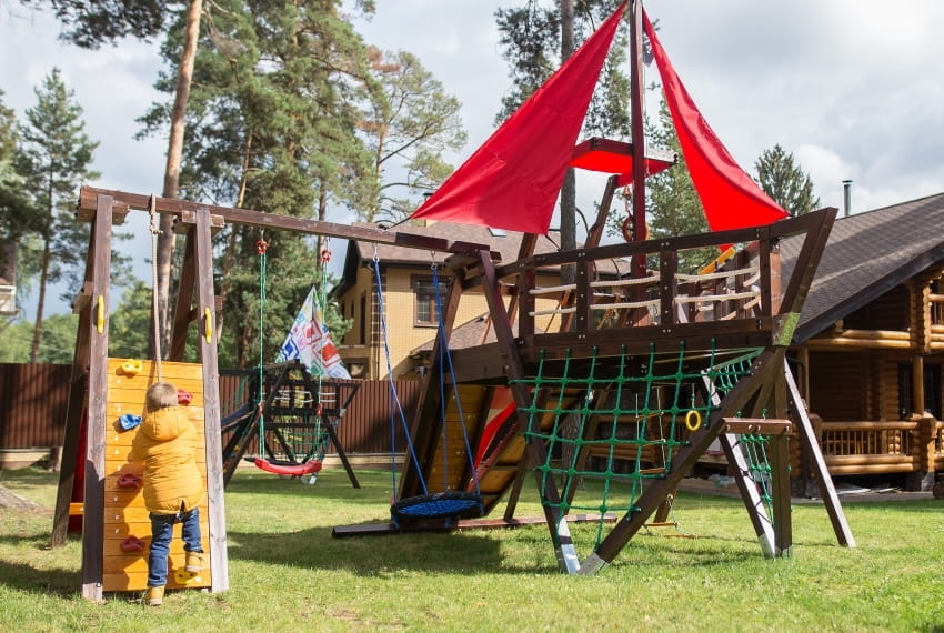Придомовой участок должен ассоциироваться прежде всего с безопасной детской площадкой, на которой можно играть в разные игры. Ведь фантазия у малышей такая, что они в любом месте могут резвиться часами. В этом случае — безопасность сооружения, должна быть под тщательным контролем. Это касается прежде всего спортивных конструкций, на которых играют маленькие дети.