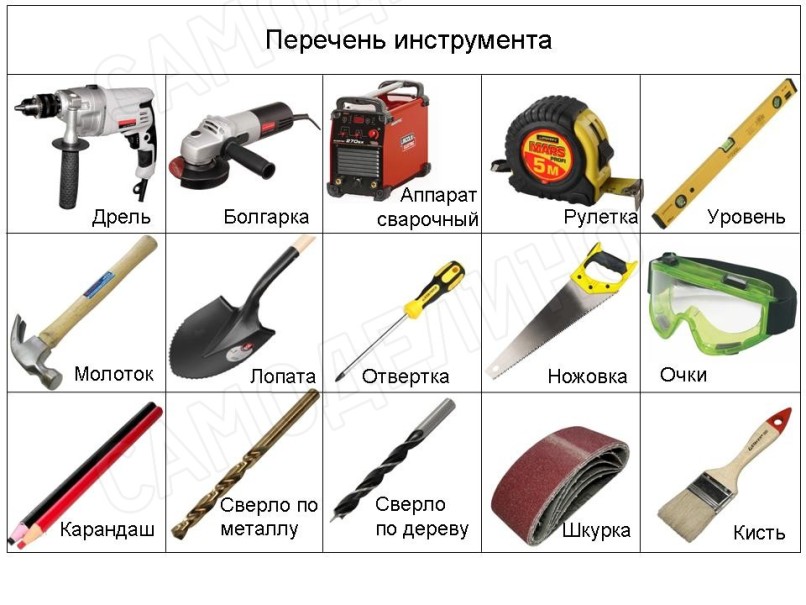 Все работы по строительству нашего игрового комплекса для улицы могут быть выполнены своими руками в домашних условиях. Основной инструмент, необходимый для изготовления городка, представлен в таблице: